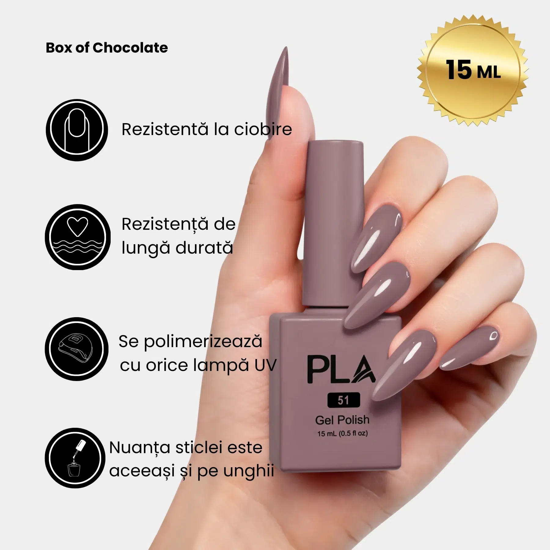 Oja semipermanentă maro ciocolatie Box of Chocolates – 51 PLA Nails este la fel de decadentă și irezistibilă ca desertul tău preferat. Creată ca pereche perfectă a lacului de unghii cu același nume, această ojă este alegerea ideală când vrei să sigilezi sub lampă și să uiți de grija retușurilor până la urmatoarea programare.