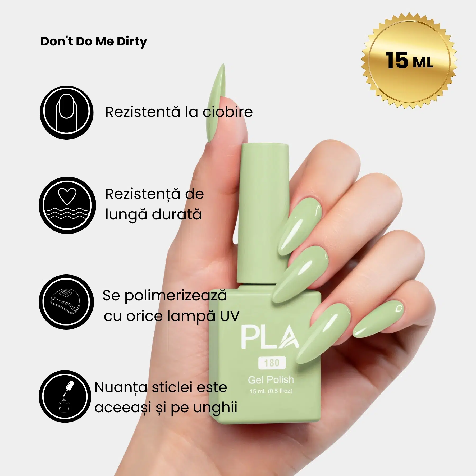 Oja semipermanentă verde Don’t Do Me Dirty – 180 PLA Nails este ca un shot de energie proaspătă, ca un sorbet de lime și lămâie. Creată ca pereche perfectă a lacului de unghii cu același nume, această ojă este alegerea ideală când vrei să sigilezi sub lampă și să uiți de grija retușurilor până la urmatoarea programare.