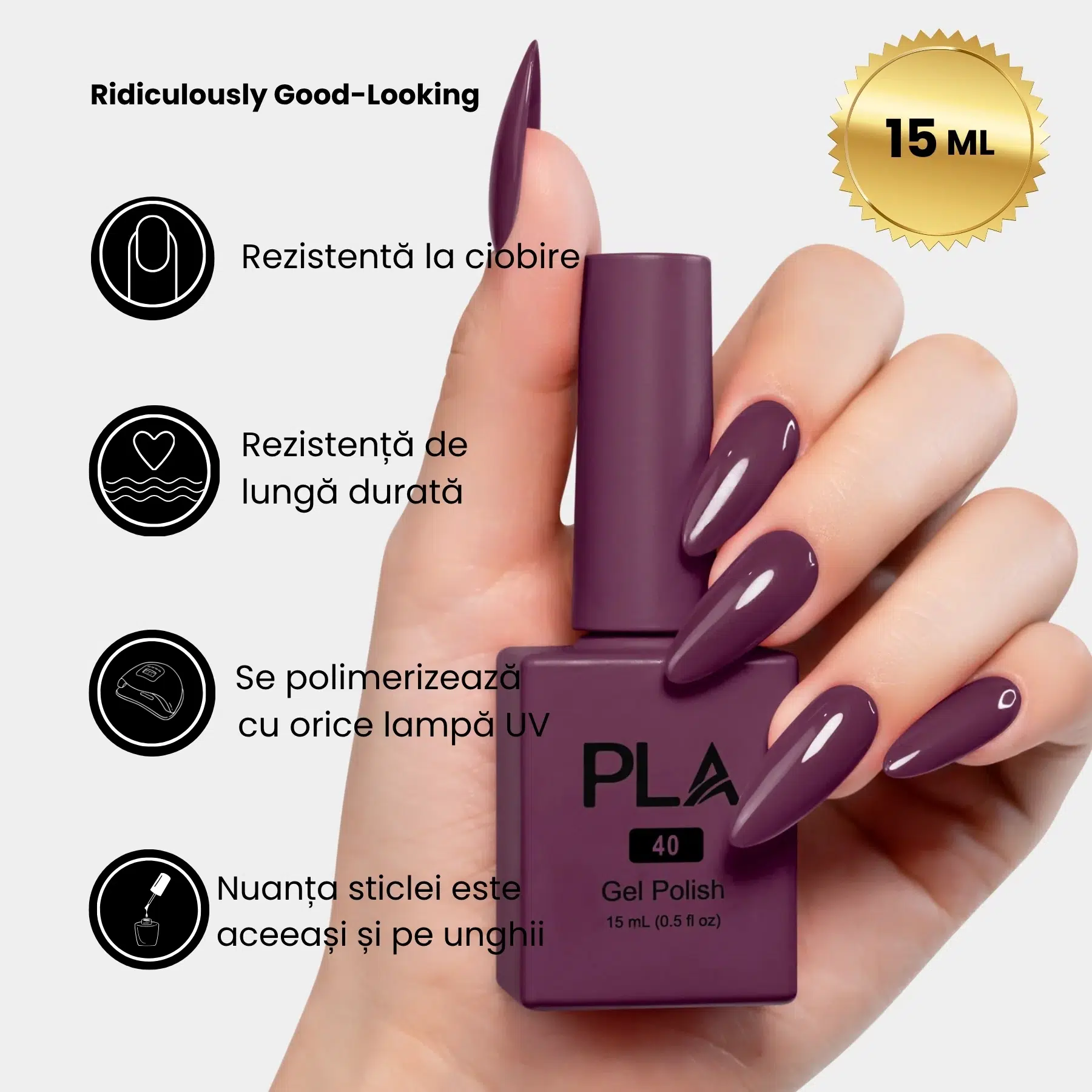 Oja semipermanentă mov prună Ridiculously Good-Looking – 40 PLA Nails este profundă și catifelată, pentru o eleganță misterioasă și plină de rafinament. Creată ca pereche perfectă a lacului de unghii cu același nume, această ojă este alegerea ideală când vrei să sigilezi sub lampă și să uiți de grija retușurilor până la urmatoarea programare.